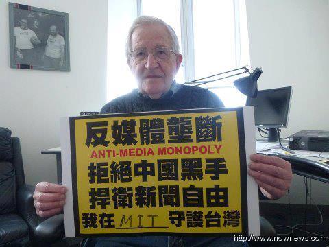 世界知名的語言學家、文化批評者喬姆斯基(N. Chomsky),因接受一名台灣學生的當面邀請,舉牌支持反媒體壟斷並拍照在網上流傳,但有學者質疑標語中「拒中國黑手」等字樣沒有英文翻譯,有隱瞞反中之嫌,因此去信詢問,結果喬姆斯基本人回信澄清,表示不知有「拒中」字樣在其中,他強調自己僅支持反媒體壟斷與新聞自由,希望外界不要擴張解釋。